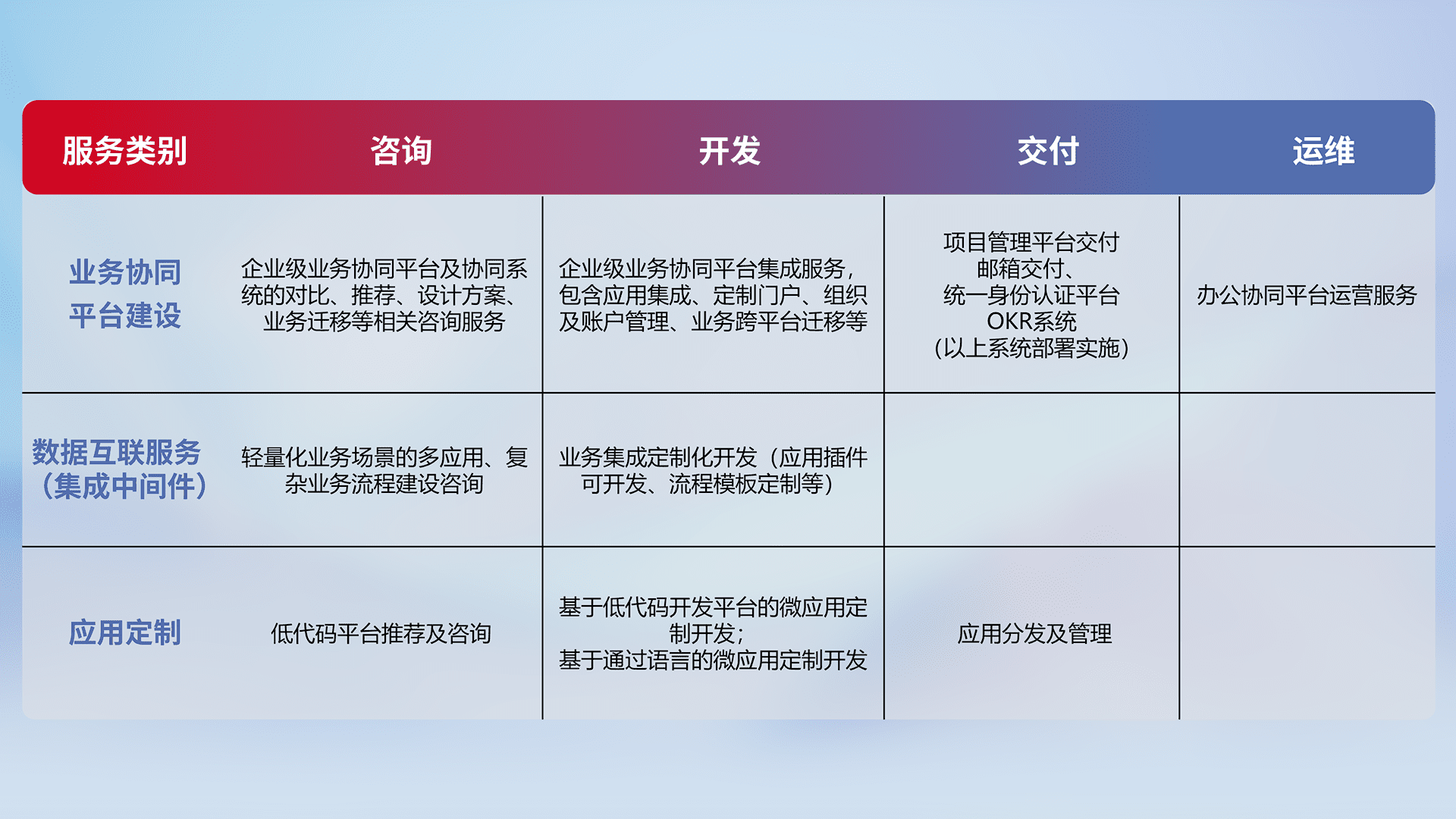 针对钉钉、、、、企微、、、IDaas等平台级产品提供产品的规划、、、、方案、、、、交付、、定制化开发等服务,,,实现如统一协同办公、、智能客户服务、、、、混合会议管理、、智能数据查询、、等业务场景,,,,实现数字化转型。。。。