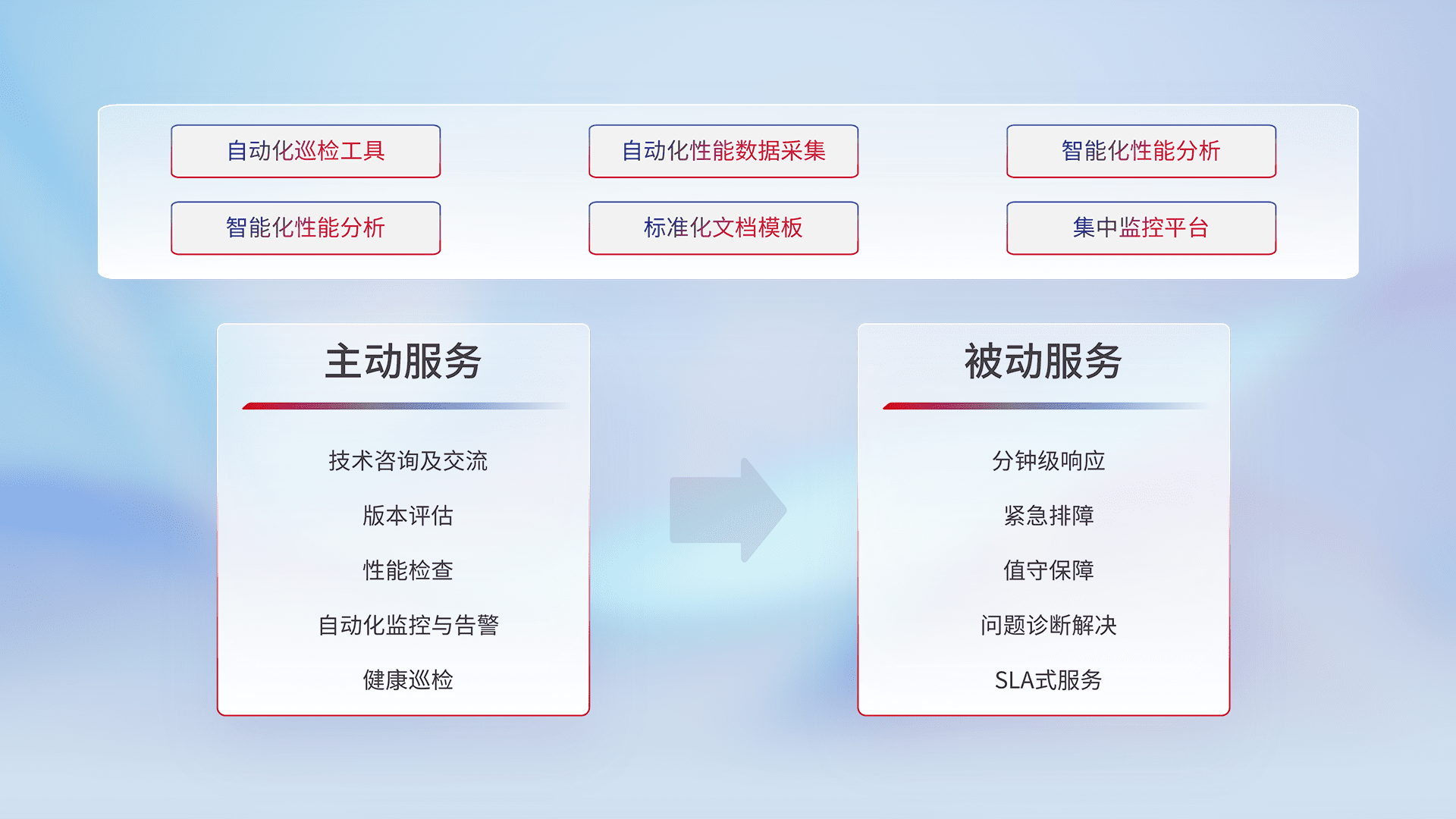 智能化工具和标准化文档,,保障服务质量,,,,提供主动服务(包含技术咨询、、、、版本评估、、性能检查、、、、自动化监控与告警、、、、健康巡检)和被动服务包含(分钟级响应、、紧急排障、、值守保障、、、、问题诊断解决、、、、SLA服务)。。。